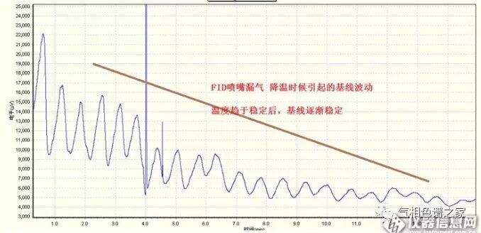 图10 FID喷咀未拧紧漏气降温时候引起的基线波动